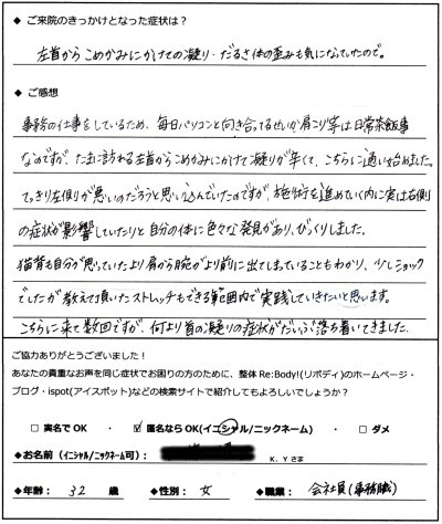 感想:事務の仕事をしているため、毎日パソコンと向き合っているせいか肩こり等は日常茶飯事なのですが、たまに訪れる左首からこめかみにかけて凝りが辛くて、こちらに通い始めました。