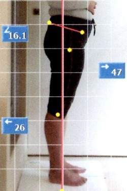 ※写真上の2つの●黄色いポイント(「膝下外側」・「お尻外側」)が真ん中の赤いライン上にあると、理想的な姿勢(下半身)となります。